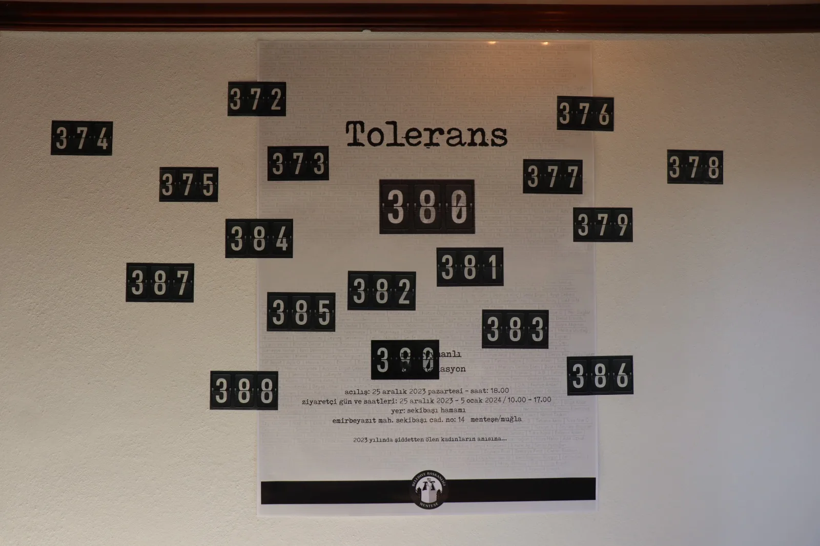 O dönemde Tolerans 174 isimli bir çalışma yaptım. 174 kadın için cam üzerine çizgi attım. Hem camın üzerine attığım çizikler hem de sürece dair ses kaydı vardı. O camı ve ses kaydını 174 kadın anısına sergilemiştim. Bu bir süreçti. Yılın sonunda da kadın ölümlerinin sayısına ilişkin verileri aldığım bir sayaç vardı ve o sayaç işlemeye devam ediyordu hatta ben bu sergiyi yaparken bile işliyor.