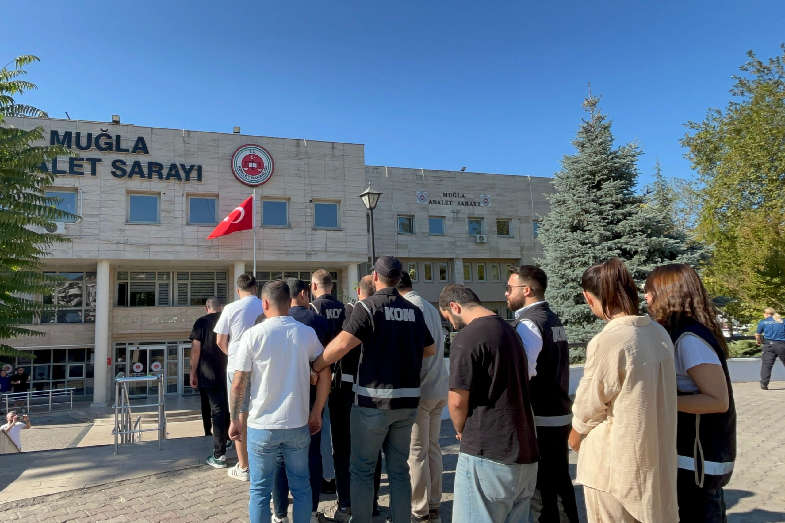Muğla Cumhuriyet Başsavcılığı koordinesinde Kaçakçılık ve Organize Suçlarla Mücadele (KOM) ekipleri tarafından Muğla, İstanbul ve Adana’da gerçekleştirilen eş zamanlı operasyonlarda yakalanan M.A., R.D., M.E., S.E., T.Ö., E.Ş., E.Ç., B.D., L.M. ve B.M. isimli şüpheliler, işlemlerinin ardından sevk edildikleri adliyede hakim karşısına çıkarıldı.