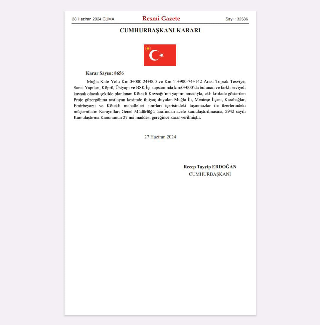 “Mugla-Kale Yolu Km:0+000-24+000 ve Km:41+900-74+142 Arasi Toprak Tesviye, Sanat Yapilar, Köpri, Ustyapi ve BSK Isi kapsaminda km:0+000′ da bulunan ve farkli seviyeli kavsak olacak sekilde plananan Kötekli Kavsagi’nin yapimi amacyla, ekli krokide gösterilen Proje güzergâhina rastlayan keside ihtiyaç duyulan Muğla ili, Mentese Ilçesi, Karabağlar, Emirbeyazit ve Kötekli mahalleleri sınırlar içerisindeki taşınmazlar ile üzerlerindeki müstemilatin Karayollar Genel Müdürlüğü tarafindan acele kamulaştırılmasına, 2942 sayili Kamulaştırma Kanununun 27 nci maddesi gereğince karar verilmiştir.”