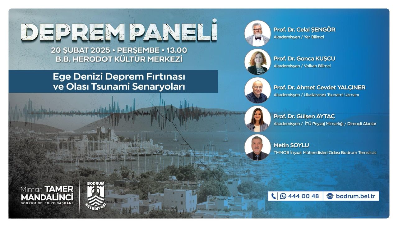 20 Şubat Perşembe günü saat 13.00’te Herodot Kültür Merkezinde “Ege Denizi Deprem Fırtınası ve Tsunami Senaryoları” konulu Deprem Paneli düzenlenecek. Panelde Yer Bilimci Prof. Dr. Celal Şengör, Volkan Bilimci Prof. Dr. Gonca Kuşcu, Uluslararası Tsunami Uzmanı Prof. Dr. Ahmet Cevdet Yalçıner, Peyzaj Mimarı ve Şehir Plancısı Prof. Dr. Gülşen Aytaç ve TMMOB İnşaat Mühendisleri Odası Bodrum Temsilcisi Metin Soylu Ege denizindeki deprem fırtınası ve muhtemel tsunami senaryoları ile ilgili değerlendirmelerde bulunacak.