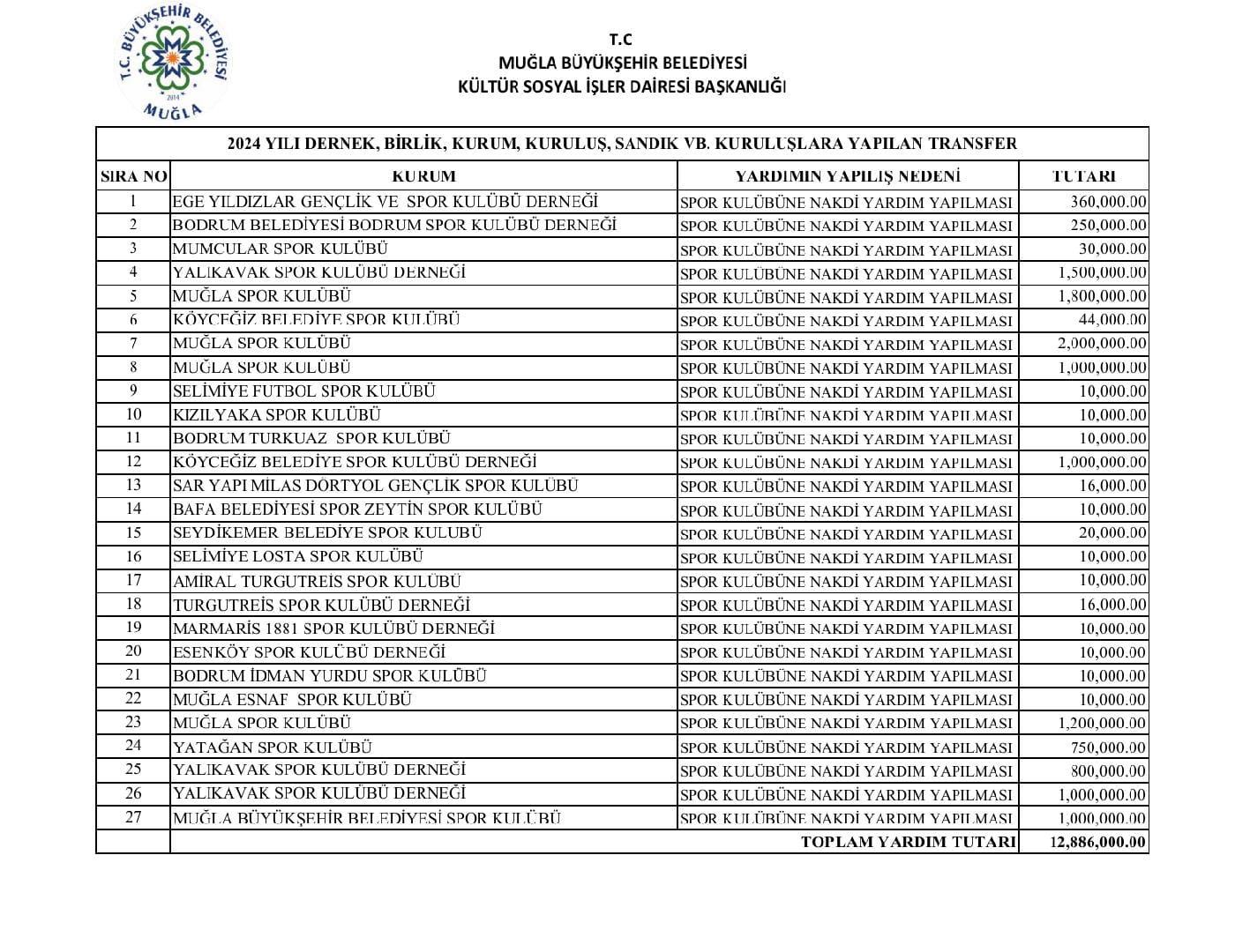 Muğla Büyükşehir Belediyesi Kültür ve Sosyal İşler Daire Başkanlığı tarafından 2024 yılında spor kulüplerine toplamda 12 milyon 886 bin TL nakdi yardım sağladığı açıklandı. Desteklenen kulüpler arasında futbol, basketbol ve diğer branşlarda faaliyet gösteren birçok kulüp bulunuyor.