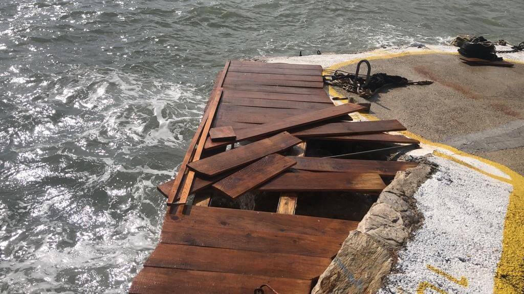 Muğla’nın Datça ilçesinde öğle saatlerinde etkili olan lodos hayatı olumsuz etkilerken, oluşan dalgalara dayanamayan tahta iskele parçalandı.