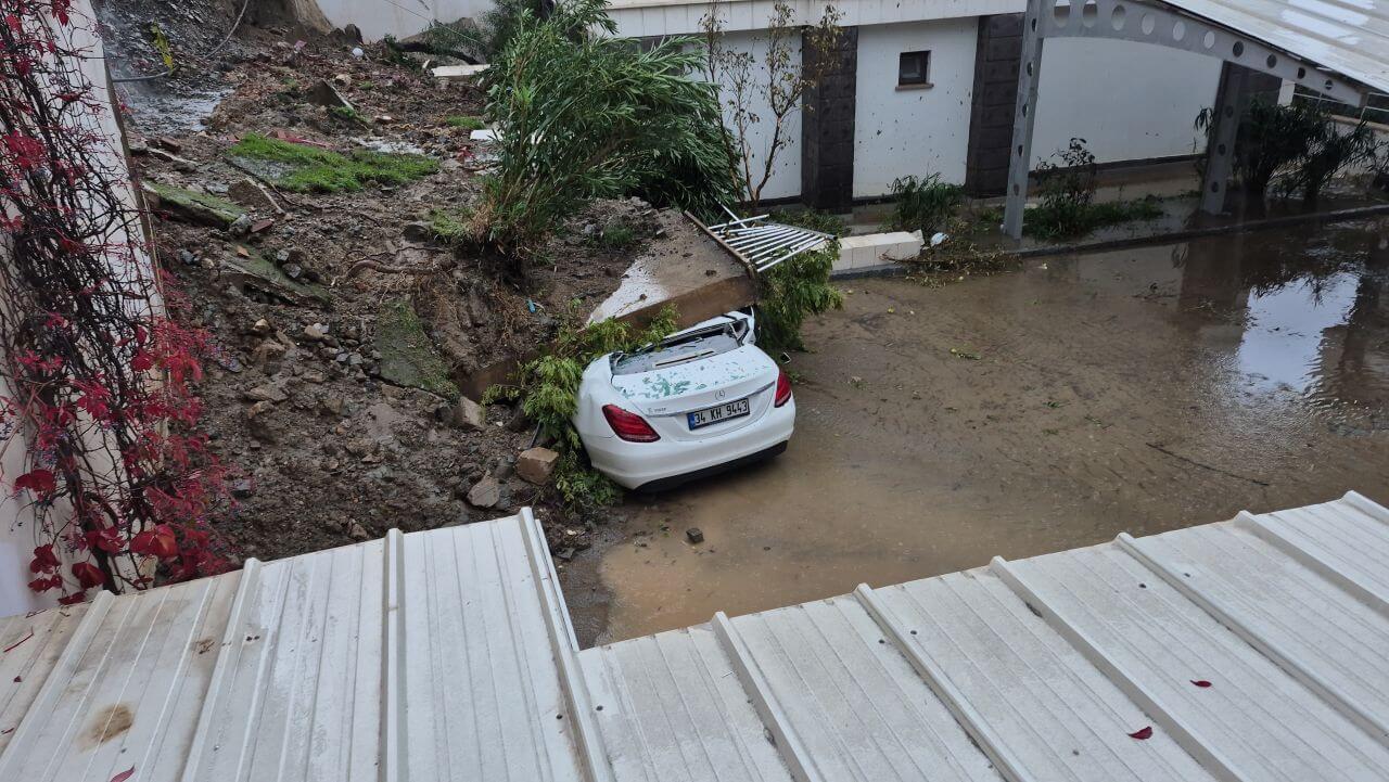 Muğla’nın Bodrum ilçesinde yağışın etkisiyle bir sitenin istinat duvarı yıkıldı. Olayda bir otomobil duvarın altında kaldı, bina zarar gördü.