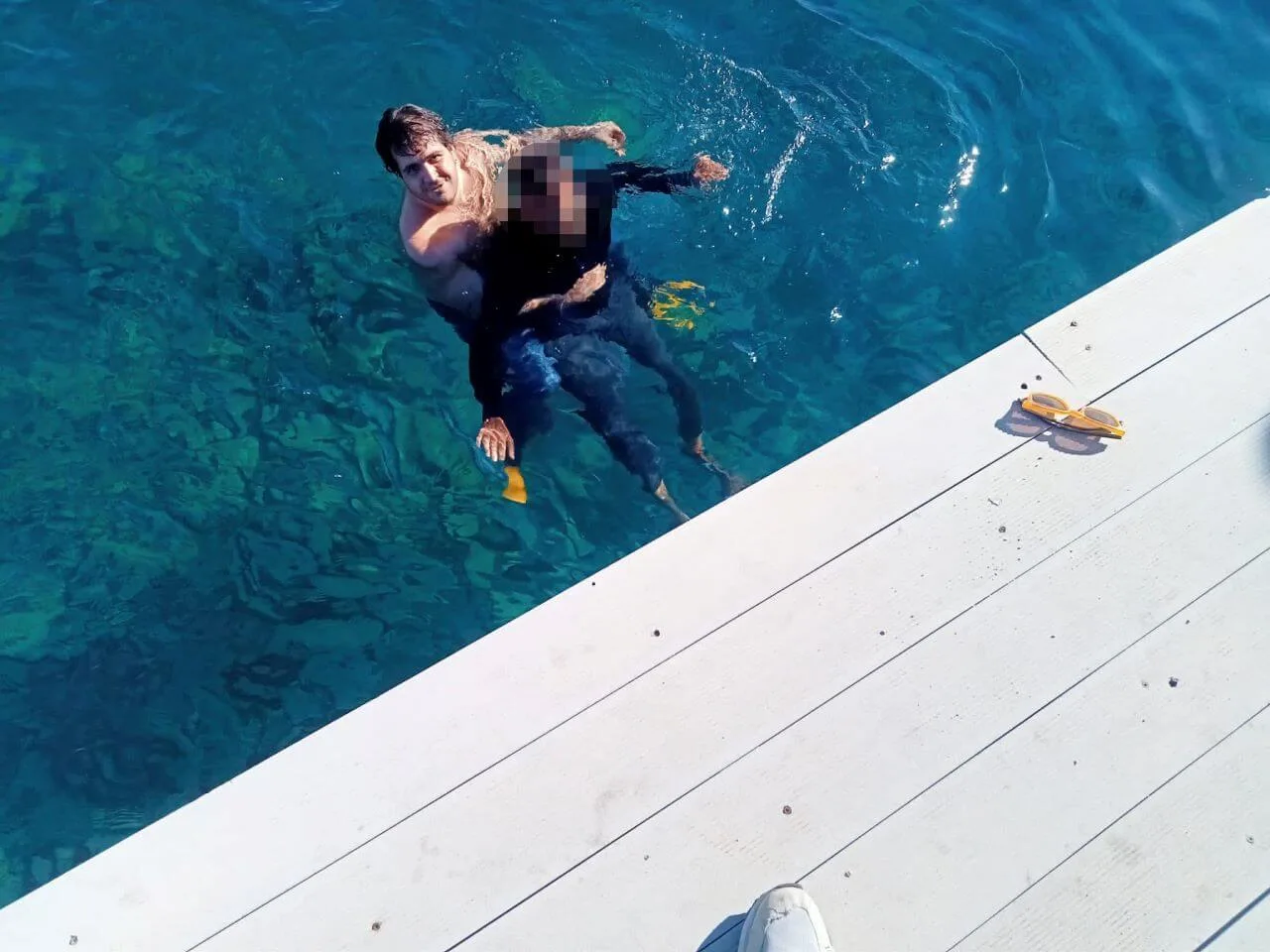 Muğla’nın Bodrum ilçesinde ayağına kum torbası bağlayıp denize atlayan şahıs, basın mensupları tarafından kurtarıldı.