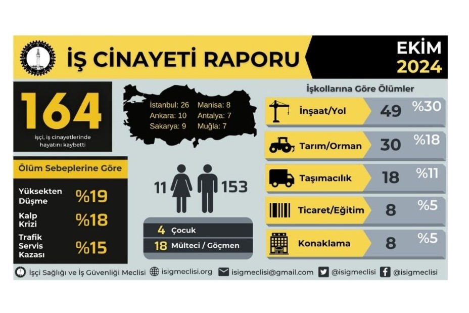 İSİG Meclisi iş cinayetleri raporunu açıkladı. Rapora göre Türkiye genelinde ise Ekim ayında 164 işçi, iş kazalarında hayatını kaybederken, yılın ilk on ayında iş cinayetlerinde toplam 1.540 işçi hayatını kaybetmiş oldu.