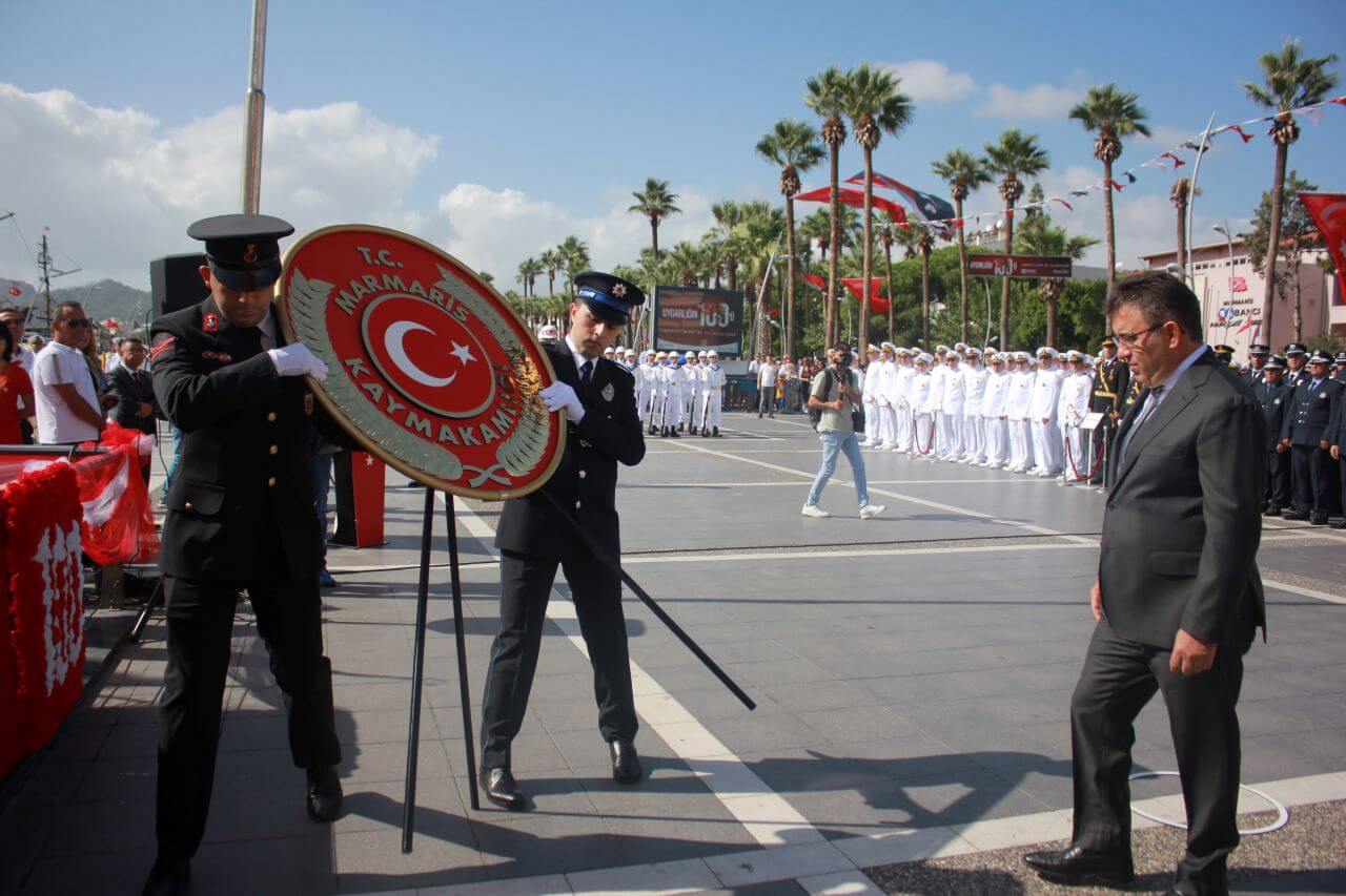 Muğla’nın Marmaris ilçesinde cumhuriyetin 100’üncü yıldönümü dolasıyla çelenk sunma töreni düzenlendi. Marmaris Kaymakamlığı, Garnizon Komutanlığı ve Marmaris Belediyesi Atatürk büstüne çelenk sundu.
