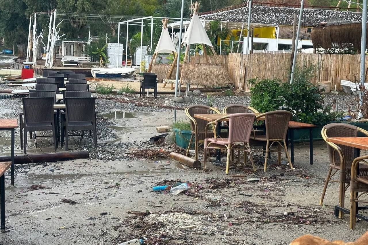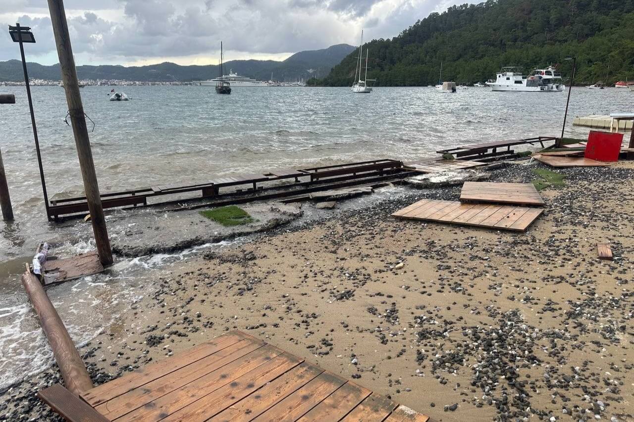 Meteoroloji 4. Bölge Müdürlüğü Bölge Tahmin ve Uyarı Merkezi ve AFAD tarafından turuncu kodla uyarı yapılan bölgelerden biri olan Marmaris’te şiddetli fırtına ve yağış aralıklı olarak etkili oldu. Hafta sonu etkili olan yağışlarda özellikle Marmaris’e bağlı olan Adaağzı Mahallesi Aktaş mevkiinde deniz taşarak kıyıdaki işletmelerin malzemelerine zarar verdi, iskele platformlarını yıktı. Aktaş mevkiinde işletmecilik yapan İbrahim Karaman; “Dün başlayan yağmur ve fırtına sebebiyle şu anda sabahın ilk saatlerinde denizin dalgaları restoranlarımızın ve sahilimizde olan platformlarımızın sökülmesine sebep oldu. Yazın sefasını sürdüğümüz yerin kışın cefasını çektiğimiz günlerdeyiz. Onun için hava şartları iklim değişikliği sebepleri ile her sene bu tür şeylerle karşı karşıya kaldığımızı belirtmek isteriz. Bu duruma çözüm tabii ki bulunabilir, kıyı şartlarının kanunlarına göre yapamadığınız çok şeyler var bunlar için çok güzel platformlar önüne engel konulabilir ama bunu da tabii ki yüksek merci kanallarından bunlara izin verilmiyor yasak olduğu için. Biz de her sene söküleni tekrar tamir edip kullanıyoruz bununla atlattığımıza şükür ediyoruz inşallah beteri olmaz” şeklinde konuştu.
