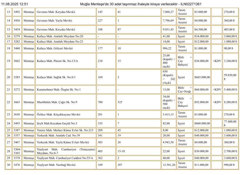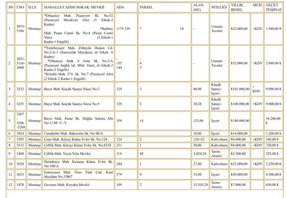 Menteşe Belediyesi, mülkiyetinde bulunan çeşitli taşınmazları 3 yıl süreyle kiraya vermek üzere ihale düzenliyor.