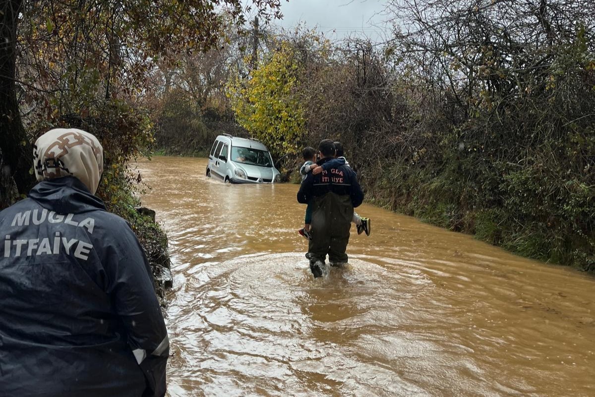 Muğla’nın Menteşe ilçesinde etkili olan sağanak yağış, hayatı olumsuz etkilerken, 4 kişilik bir aile araçlarında mahsur kaldı.