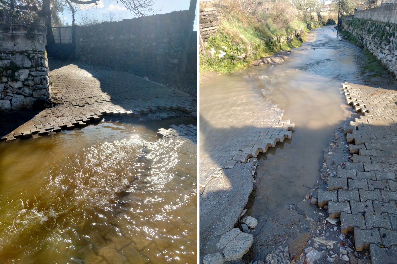 Yağışların ardından sokakta su birikintileri oluştuğu, bazı noktalarda kilit parke taşlarının yerinden söküldüğü ve zeminde çökmeler meydana geldiği görüldü. Sokak boyunca akan çamurlu su, geçişleri zorlaştırırken özellikle dar alanlarda ulaşımın aksadığı belirtildi.