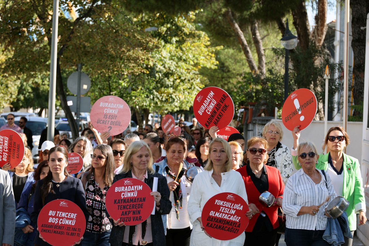 CHP Muğla İl Kadın Kolları 17 Ekim Dünya Yoksullukla Mücadele Günü kapsamında il binasında toplanan kadınlar, ellerinde tencere ve tavalar ile “Buradayım çünkü kadının adı var hakkı yok”, “Açlık değil onurlu yaşam istiyoruz” yazılı dövizlerle Sınırsızlık Meydanı’na yürüdü.