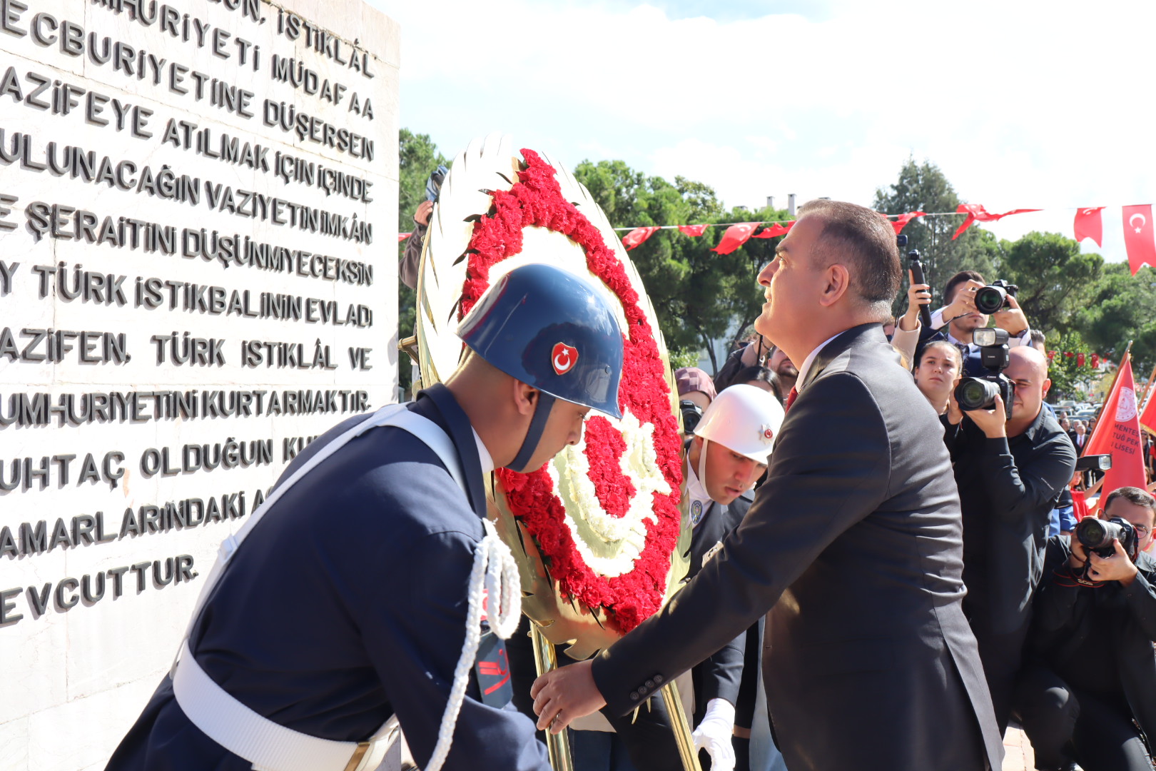 Atatürk Anıtı’na Valilik, Garnizon Komutanlığı ve Büyükşehir Belediye Başkanlığı çelenklerinin sunulmasının ardından saygı duruşunda bulunuldu ve İstiklal Marşı okundu.
