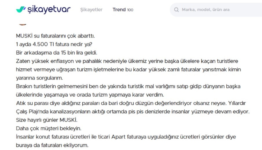 Bazı vatandaşlar da yüksek gelen su faturalarına tepki gösterdi. Şikayet sayfasından sesini duyurmaya çalışan bir vatandaş, “MUSKİ su faturalarını çok abarttı. 1 ayda 4.500 Tl fatura nedir ya? Bir arkadaşıma da 15 bin lira geldi. Zaten yüksek enflasyon ve pahalılık nedeniyle ülkemiz yerine başka ülkelere kaçan turistlere hizmet vermeye uğraşan turizm işletmelerine bu kadar yüksek zamlı faturalar yansıtmak kimin yararına sorgularım. Atık su parası diye aldığınız paraları da bari doğru düzgün değerlendiriyor olsanız neyse” dedi.