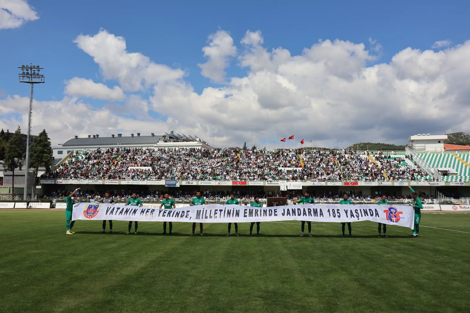 Yeşil beyazlı takım Jandarma Teşkilatı’nın kuruluşunun 185. yılı nedeniyle sahaya, “Vatanın her yerinde milletin emrinde Jandarma 185 yaşında” yazılı pankart ile çıktı.