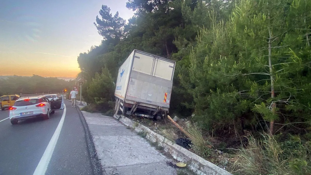 Muğla Sakartepe rampasında meydana gelen tek araçlı kazada bir lojistik firmasına ait kamyon sürücüsü direksiyon hakimiyetini kaybederek yolun sağ tarafına yan yattı.