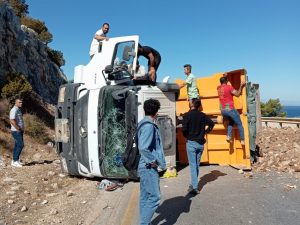 Hafriyat kamyonu devrildi, yol 2 saat trafiğe kapandı