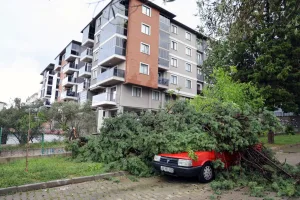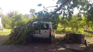 Fırtınada devrilen ağaç, aracın üstüne düştü