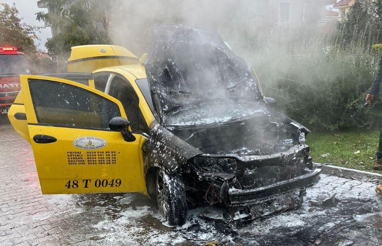 Muğla’nın Menteşe ilçesinde seyir halindeki bir ticari takside çıkan yangın sonucu araç kullanılamaz hale geldi.