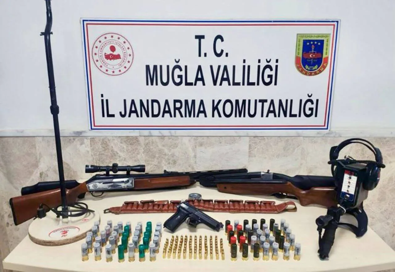 Yapılan aramada; tabanca, 85 adet tabanca fişeği, 2 adet havalı tüfek, 2 adet yivsiz av tüfeği, 125 adet 12 calibre fişek, el dedektörü ve kaçak kazıda kullanıldığı değerlendirilen muhtelif malzeme ele geçirildi.